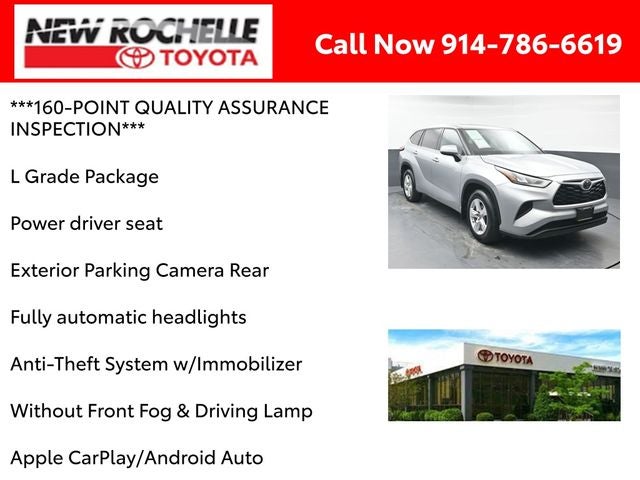 Powered by a robust 3.5L V6 DOHC engine and an 8-Speed Automatic transmission with AWD, this Highlander L delivers impressive performance and outstanding fuel efficiency, with an EPA-estimated 20 MPG in the city and 27 MPG on the highway. Whether you're navigating city streets or tackling winding country roads, this SUV's dynamic handling and advanced safety technologies will provide you with a confident and secure driving experience.