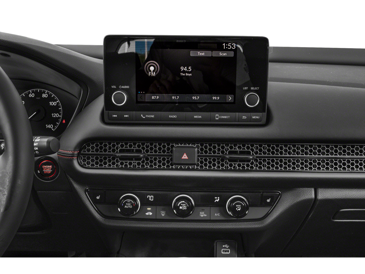 The interior of the HR-V Sport is designed with your comfort and convenience in mind. Heated front bucket seats, a leather-wrapped steering wheel, and a 180-Watt audio system with 6 speakers ensure a premium driving experience. The spacious cabin and versatile split-folding rear seats provide ample room for your passengers and cargo, making it the perfect companion for your adventures.